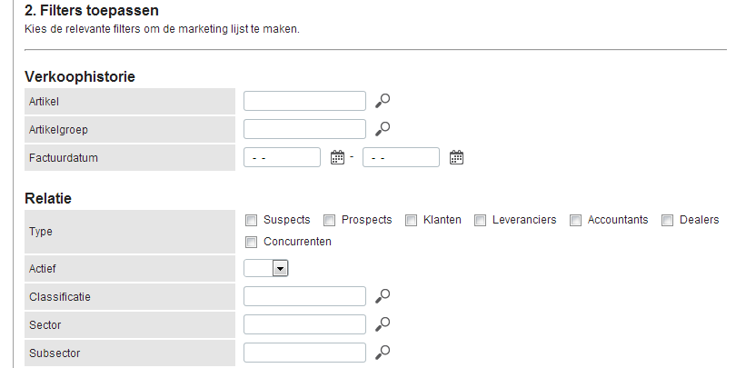 Bij stap 2 kunt u verschillende filters toepassen. Wanneer u bijvoorbeeld alleen relaties wilt bereiken die een bepaald artikel hebben afgenomen, kunt u bij de ‘Verkoophistorie’ een ‘Artikel’ selecteren.