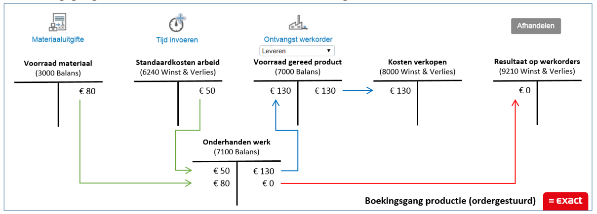 Als we een artikel produceren dat we vervolgens direct doorleveren aan de klant die het besteld heeft, dan worden de boekingen gemaakt aan de hand van de waarde van het onderhanden werk. De kostprijs van de artikelkaart speelt dan dus geen rol. Wel is het belangrijk dat er een verkooporder ten grondslag ligt aan de werkorder. Een artikel dat we dusdoende produceren noemen we ordergestuurd.