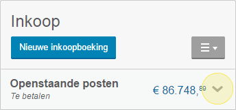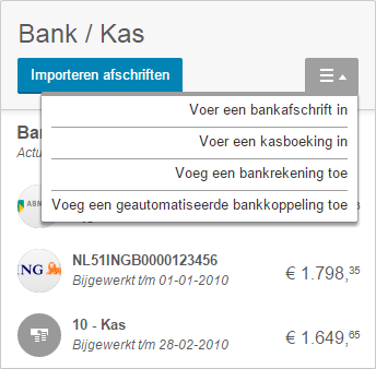 U kunt alle acties vinden onder de blauwe knoppen of onder de drop-down menu’s in de bank/kas-, verkoop-, inkoop- of resultaat sectie. Wanneer u bijvoorbeeld een kasboeking wilt aanmaken, klikt u op het drop-down menu in de bank/kas sectie. Wanneer u een inkoopfactuur wilt invoeren klikt u op het drop-down menu in de inkoop sectie. Om memoriaalboekingen aan te maken klikt u op de blauwe knop in de sectie Resultaat.
