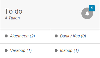 De To do sectie toont financiële en algemene taken die u nog dient af te handelen, zoals bijvoorbeeld het uitvoeren van de BTW aangifte of het versturen van herinneringen. Wanneer u op de knoppen Algemeen, Bank/Kas, Verkoop of Inkoop klikt, wordt de sectie uitgeklapt. Om alle secties in één keer uit te klappen kunt u op het icoon met de bel klikken. U ziet nu alle openstaande taken, en kunt deze realiseren.