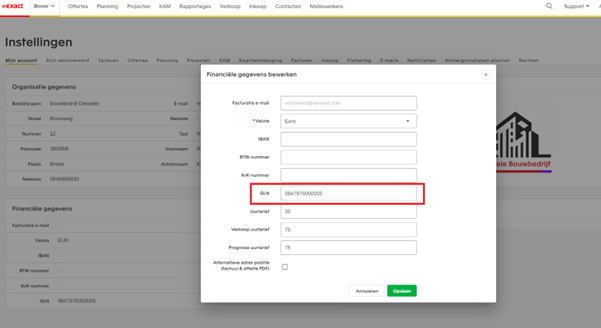 Naast deze instelling geef je ook bij je opdrachtgever de gewenste GLN code in van de ontvanger. Bij facturatie geef je aan dat je de factuur met de SALES005 standaard wilt versturen zoals te zien is op afbeelding 2. Meer informatie hierover vind je hier.