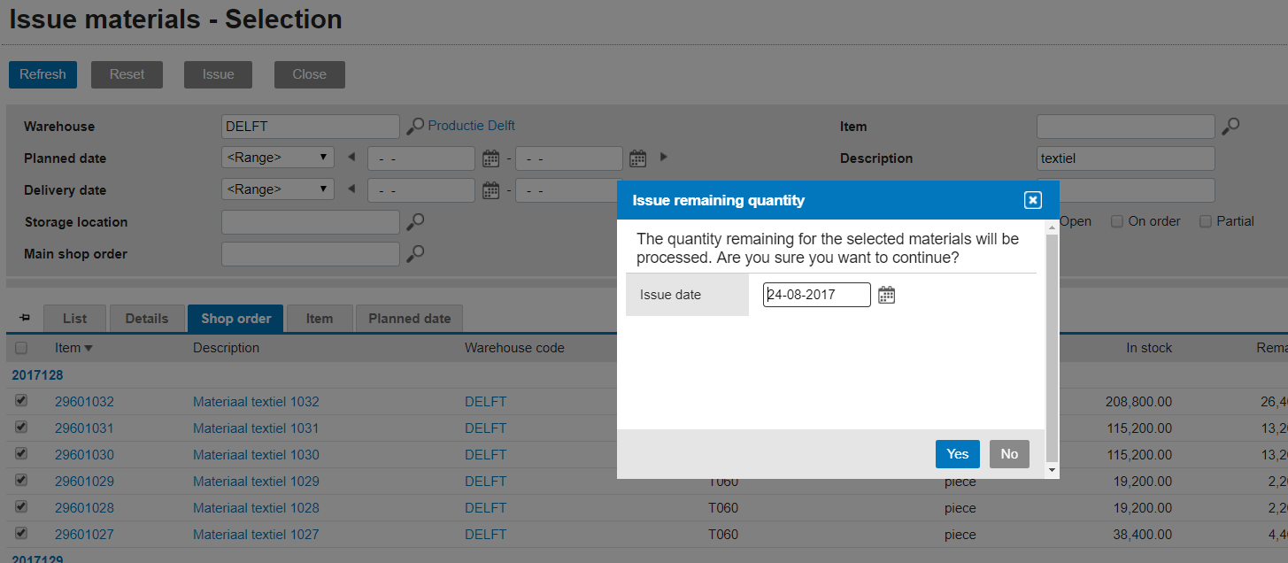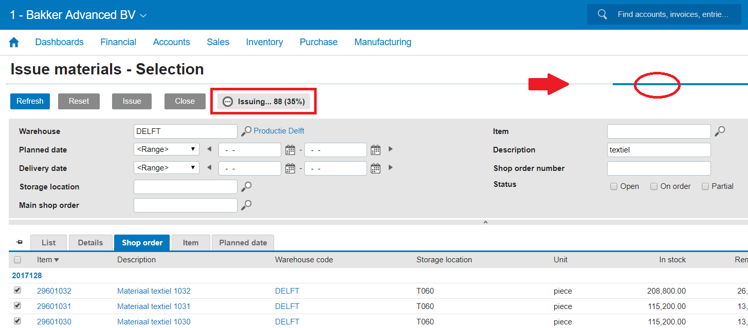 Earlier this month we have released an improvement of the demand planning process: https://blogs.exact.com/products/2017/08/enhancing-the-performance-of-exact-for-manufacturing Issue materials as a background process With Issue materials ([Manufacturing] Issues & reversals, Create), we can select all planned material for multiple shop orders, and make an issue. Below 50 lines, an immediate issue will be made. If the number of lines exceeds 50 we will see a prompt that will trigger the background process if we choose Yes: