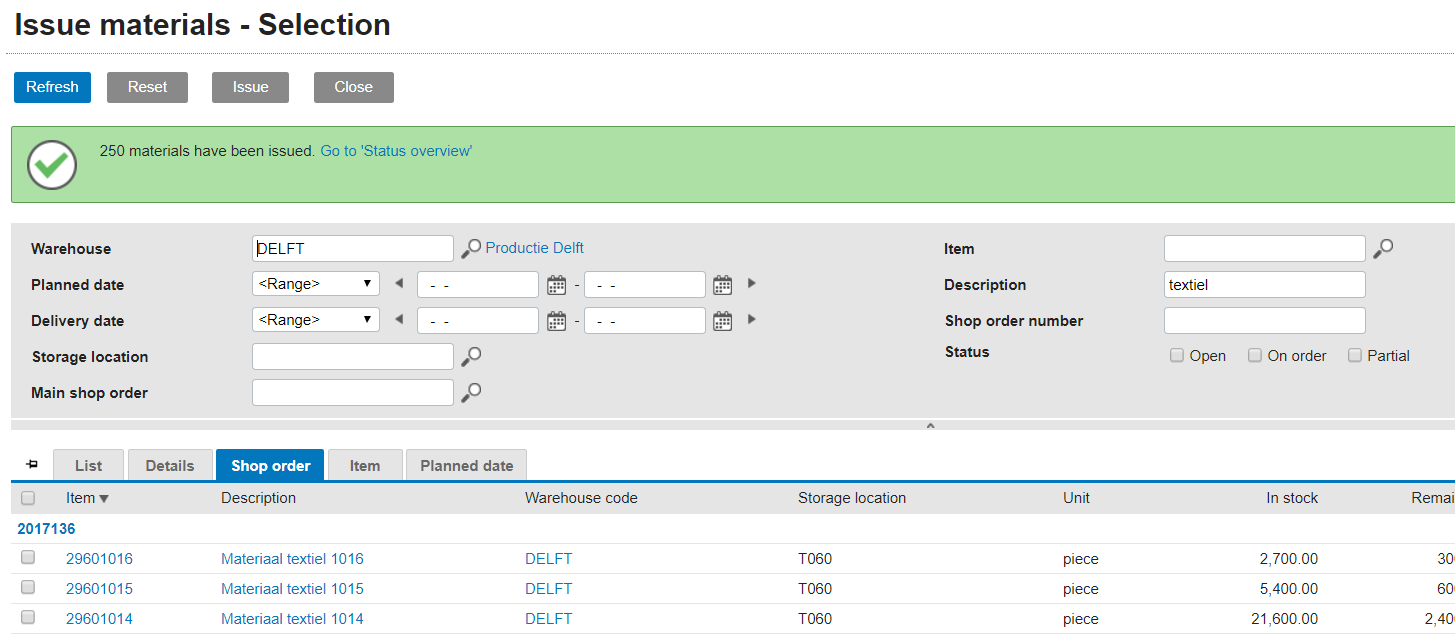 (Click to enlarge) Upon completion of this task, a status bar is displayed with a link to the list of issued materials and a specific mention of lines not issued (for example serial/batch materials, or materials with insufficient stock (provided the setting Allow negative stock is unchecked)):