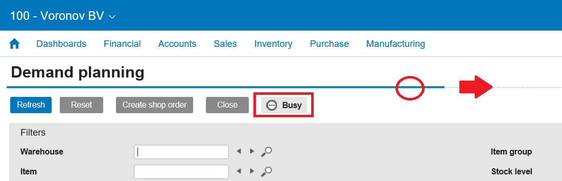 Demand planning as a background process With Demand planning ([Manufacturing] Planning, Demand planning), we can select all requirements for products (originating from all sales orders and all inventory positions) and generate shop orders for replenishments with one push of a button. Where this screen started to churn out a (potentially long) list of shop orders generated, we will now see a progress bar and a notification “busy” until this (background) process is finished. We can navigate to a different screen and continue working while Exact for Manufacturing completes the task: