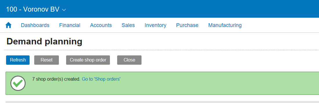 Once the generation of shop orders is completed we see a green notification bar with the number of shop orders generated. If we want we can navigate to the full list: