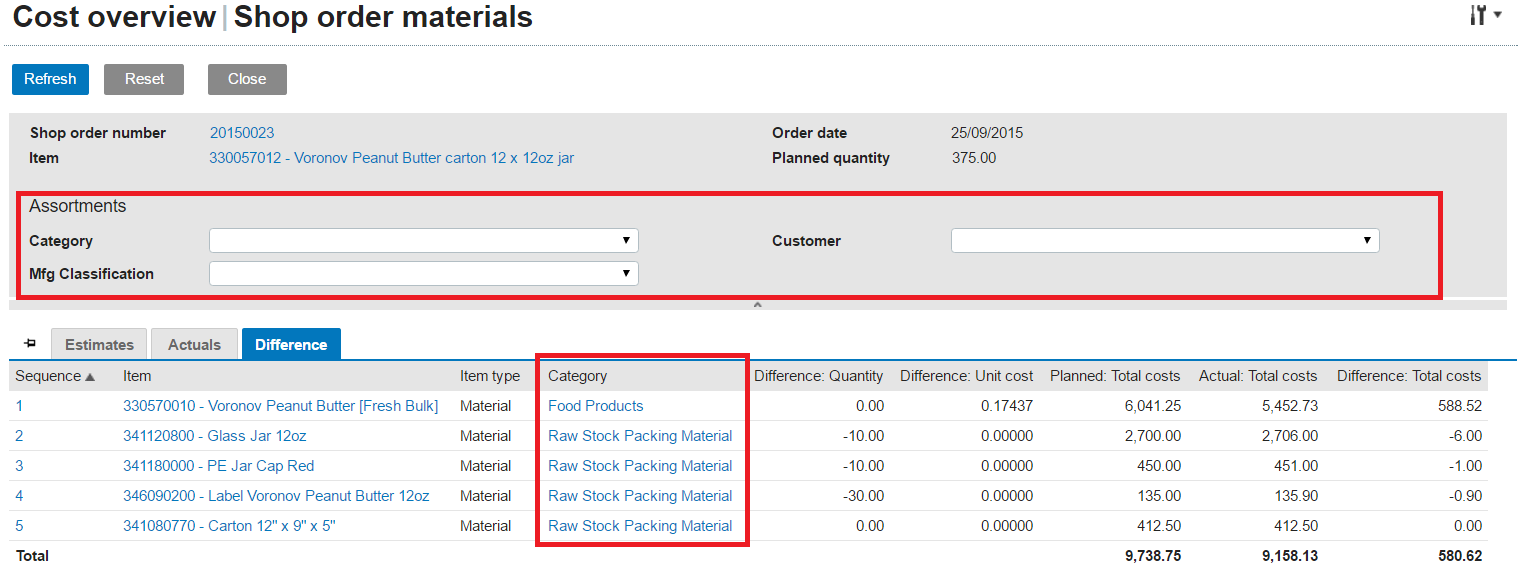 (Click to enlarge) In the cost overview, but also in the shop order materials (detail), we can customize to show the assortments in the lines: