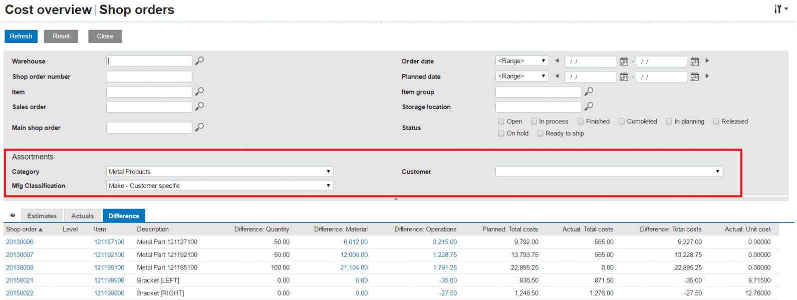 Assortment filters in the cost overview We will find the cost overview in [Manufacturing] Shop orders, Reports, Cost overview. With the customize icon in the right upper corner of the overview we can add specific assortments to the filter of the overview: