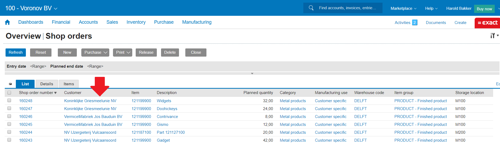 Exact for Manufacturing Ease of Use: Customer name in shop order overview