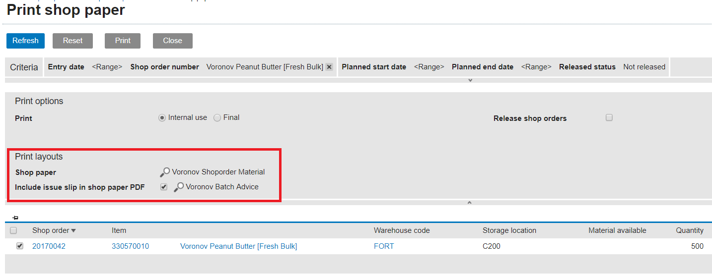 Option to print the shop order material issue slip with the shop paper When we print a shop paper (using the Print button of the shop order, or via [Manufacturing] Planning, Print shop paper) we have the option to “Include the issue slip in the shop paper PDF”. Checking this option will cause the shop order material issue slip to be appended to the shop paper: