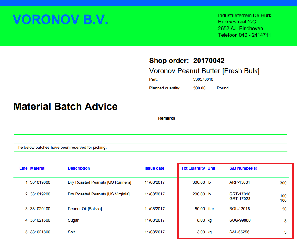 There are several layouts that list shop order materials, such as the shop paper, the manufacturing picking list and the manufacturing cluster picking list. None of these are suited to direct the warehouse staff to pick specific serial- or batch numbers. We are now introducing the shop order material issue slip to help you precisely with that objective: pick the right batch.