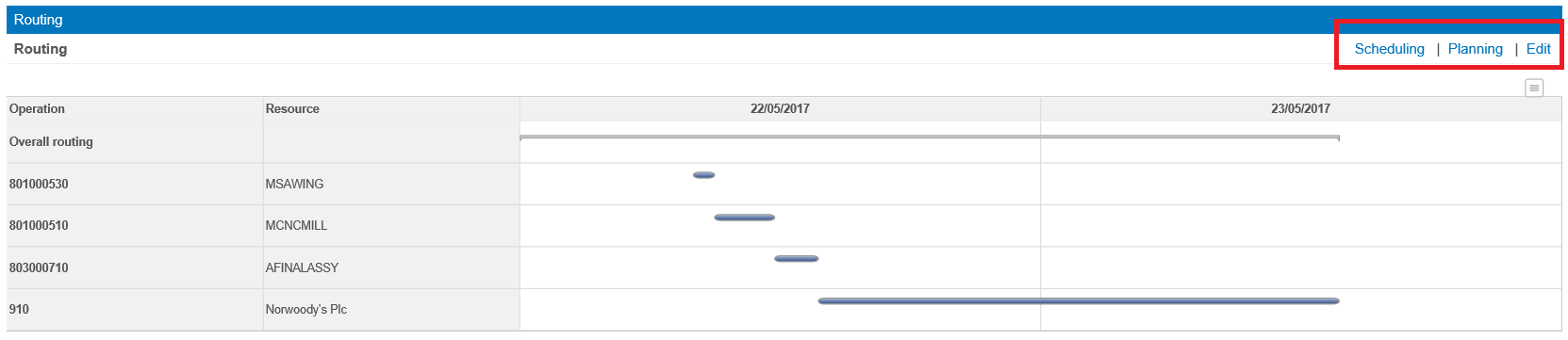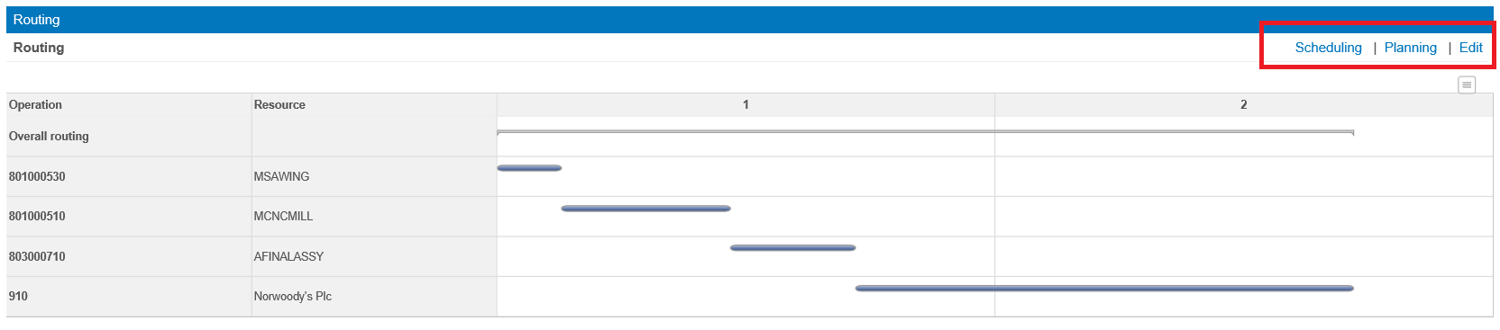 (Click to enlarge) The result of this scheduling is shown on the routing tab of the shop order, in the Gantt chart: