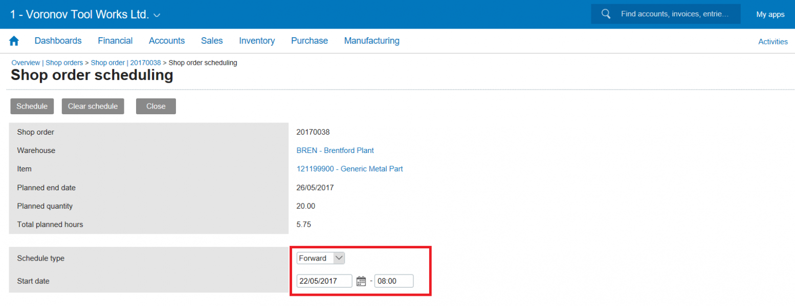 Introducing time in shop floor planning Since we started working with various third party shop floor scheduling solutions we have introduced the planned (start and end) time of operations. The unplanned shop orders (no date and time filled) are enriched by the scheduling solution with a planned start and end date and time. We are now displaying the start and end time on the shop floor planning screen, and in the Gantt chart on the shop order. Scheduling against infinite capacity We are about to release functionality to automatically assign a forward, backward or inside-out scheduled time to the shop order operations against infinite capacity. So, please note that if a shop order needs to be scheduled against finite capacity you will need a (third party) scheduler which you will find in the Exact Online App Store. When we create a new shop order, we find on the routing tab of the shop order a Gantt chart of the unplanned operations. Notice the new hyperlink Scheduling: