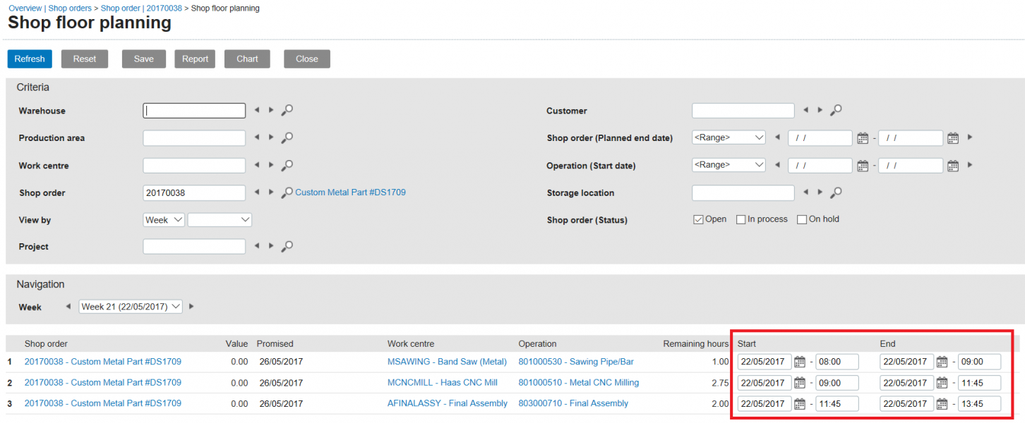 (Click to enlarge) When we click the hyperlink Planning, we are routed to the shop order planning screen and shown the dates and times scheduled for this shop order. Notice also the buttons at the top for Report and Chart.