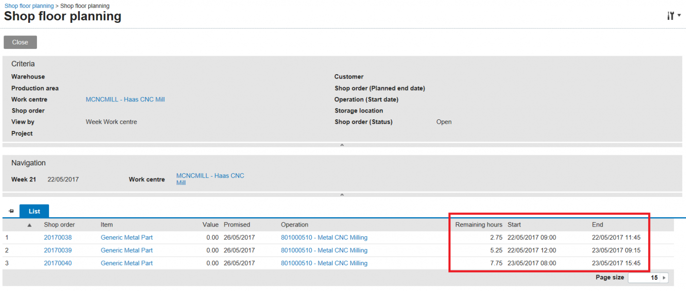 (Click to enlarge) We can use the shop floor planning screen to view all planned operations for a certain work center in a selected week, and make a report with the Report button: