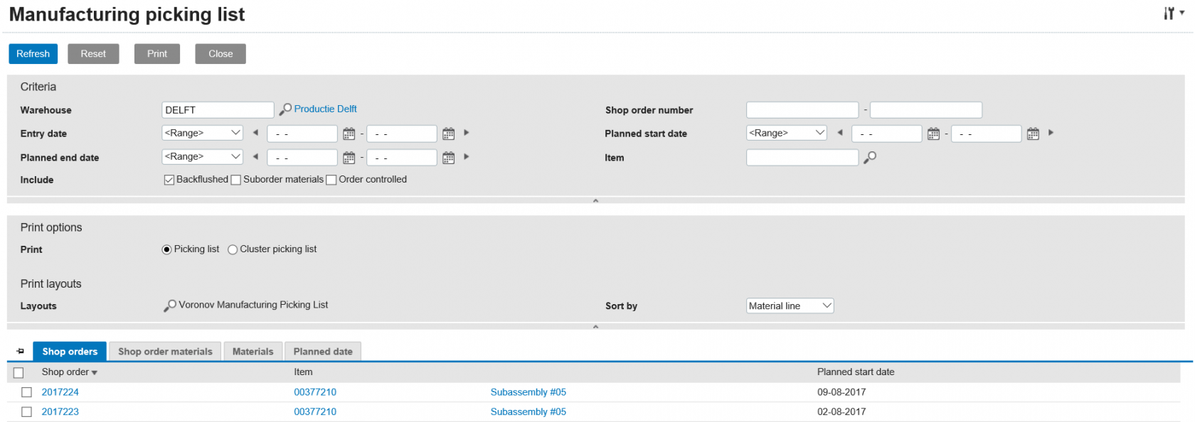 Printing a manufacturing picking list or cluster picking list Via the menu path [Manufacturing] Issues & reversals, Picking list we can select a shop order or multiple shop orders and print a manufacturing picking list or cluster picking list. The picking list is for each shop order separately, the cluster picking list is for the combined materials of multiple shop orders. Alternatively, we can navigate to this screen using the Print button on the shop order card: