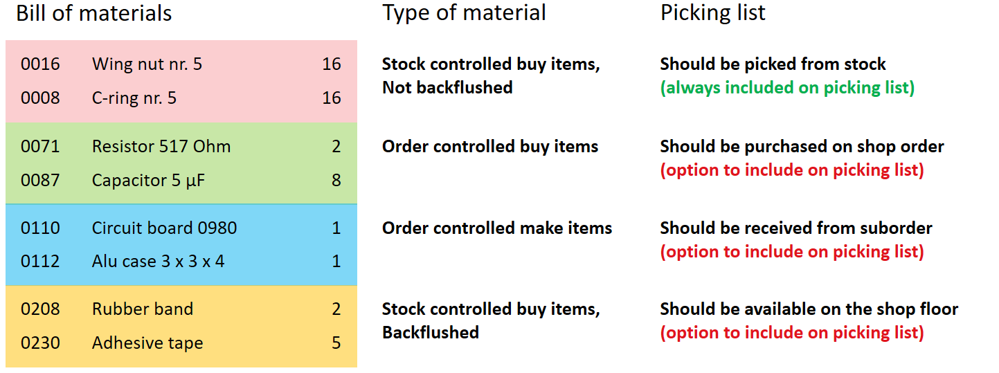 (Click to enlarge) The manufacturing picking list contains by default all the shop order materials that are stock controlled and not backflushed. We may include other types of materials like those that are order controlled (make and/or buy) and stock controlled that are backflushed: