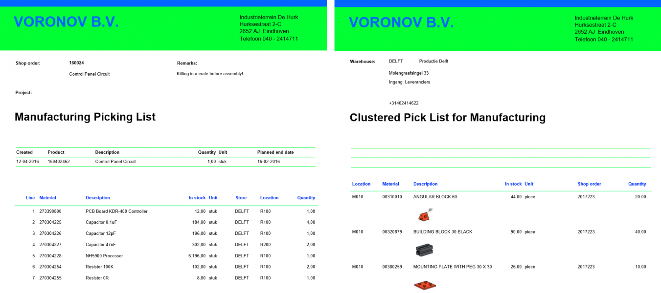 We can collect shop order materials in the warehouse using Smart Shop Floor Material Management. But we also support the good old printing of a picking list, a concept that we are already familiar with in the sales order delivery process. We have recently released the manufacturing picking list and the manufacturing cluster picking list.
