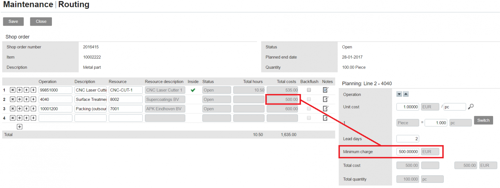 Maintaining the minimum charge for an outside service In the routing we can maintain the minimum charge for an outside service. When, for example, the regular charge for surface treatment is 1 EUR per piece, the calculated cost for 100 pieces is 100 EUR. With a minimum charge of 500 EUR, the latter precedes in the order calculation: