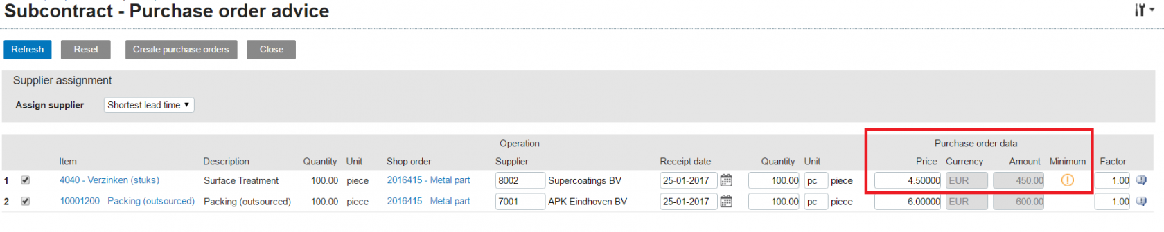 Application of the minimum charge in the purchase order advice The subcontract purchase order advice will apply this minimum charge and show a green check mark in a (new) column Minimum. As all purchase order lines are currently calculated from a unit price times order quantity, a unit price corresponding with the order quantity is recalculated. In this case it is 5 EUR instead of the (regular) 1 EUR: