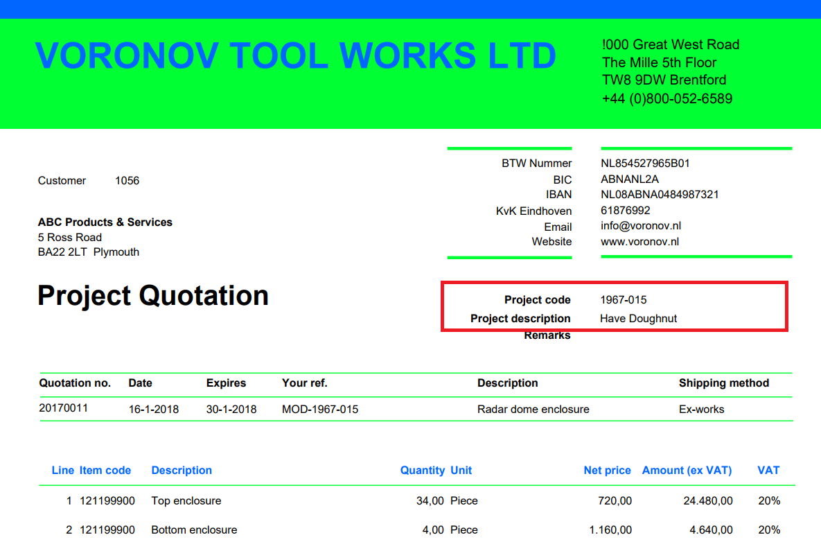 Project references added to the layouts The Project code and Project description were already in the shop paper layout. We have added the Project Code and Project description to the quotation header: