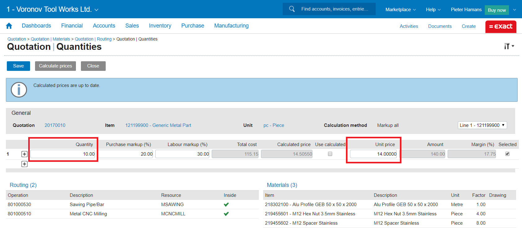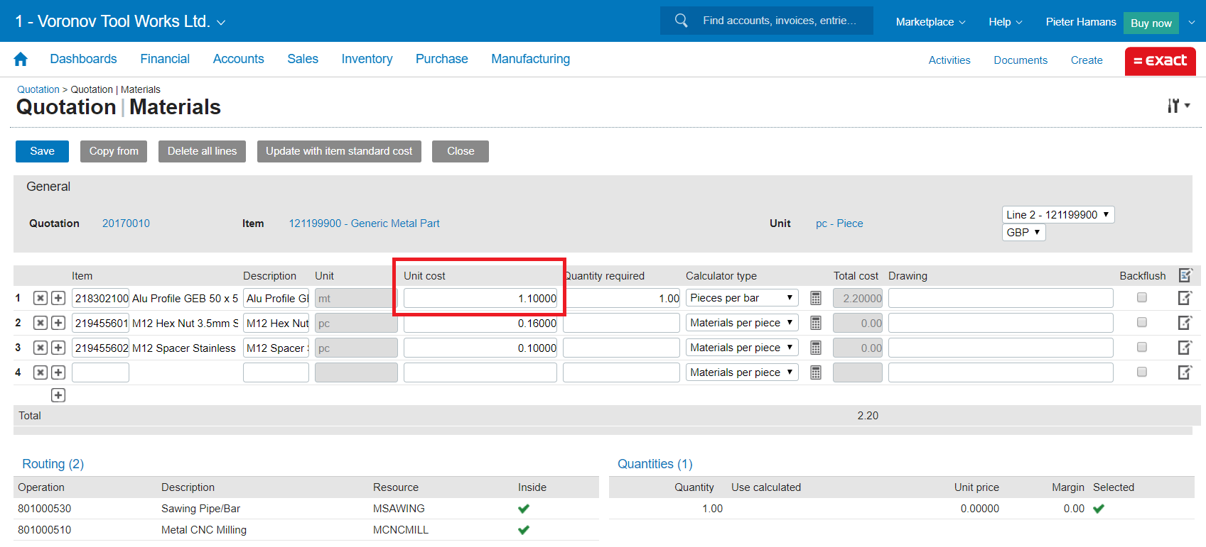 (Click to enlarge) Calculating with a different material price for a larger price break As an example we enter a quotation line for a “Bracket [LEFT]” for 10 pieces. We are using as material Alu profile of 1,60 British pound per meter. We arrive at a sales price of 14,00 pound per bracket:
