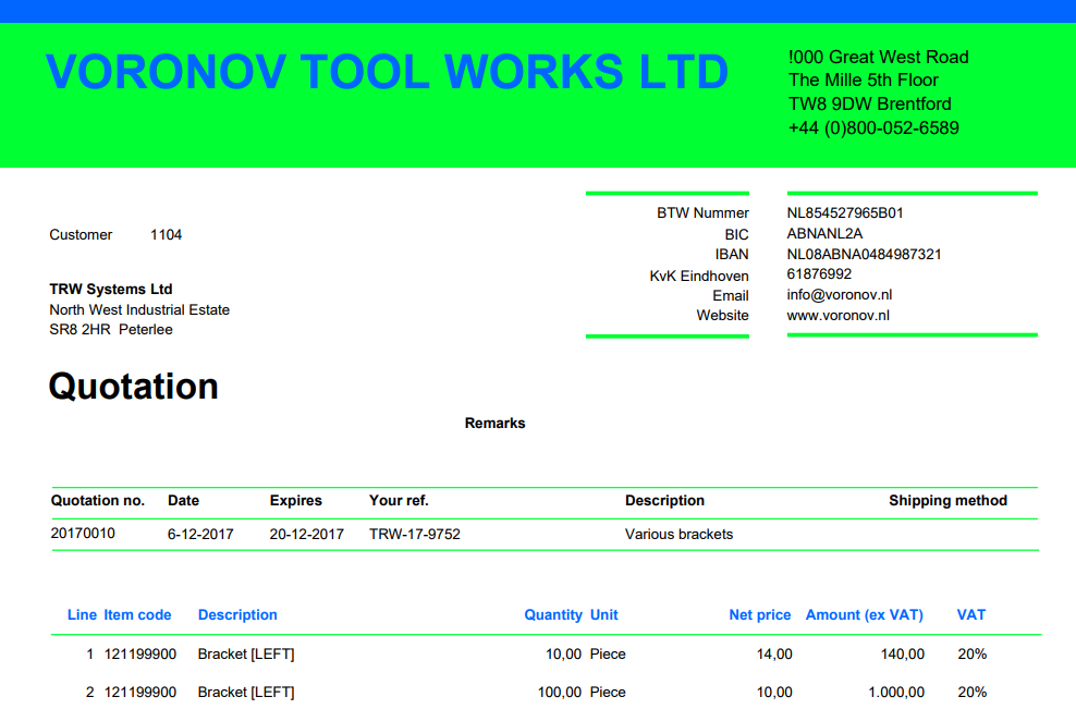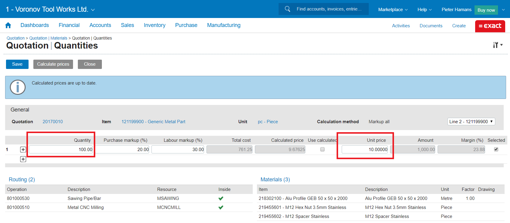 (Click to enlarge) The quotation calculation for 100 pieces leads then to a sales price of 10,00 pound: