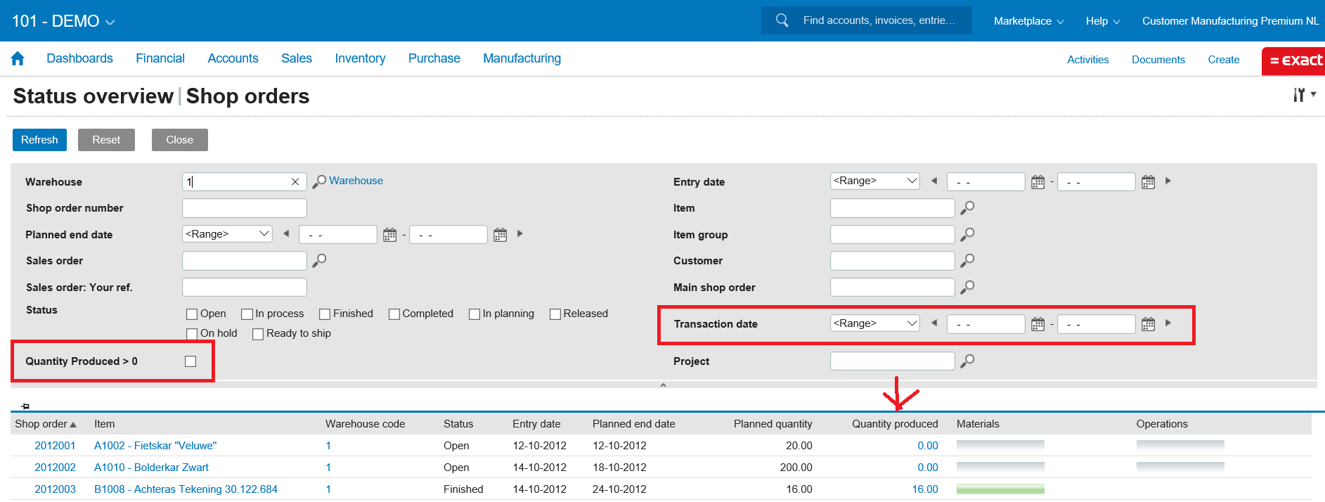 (Click to enlarge) The limitation of this overview is that it shows items that are received in stock or that are delivered to the customer. Subassemblies that remain the work in process (“issued to parent”) are not included in this report. Viewing the quantity produced through the Status overview | Shop orders In [Manufacturing] Shop orders, Reports, Status overview we have added filters to select a Transaction date (i.e. the date received) and Quantity produced > 0 (i.e. only shop orders with items received):