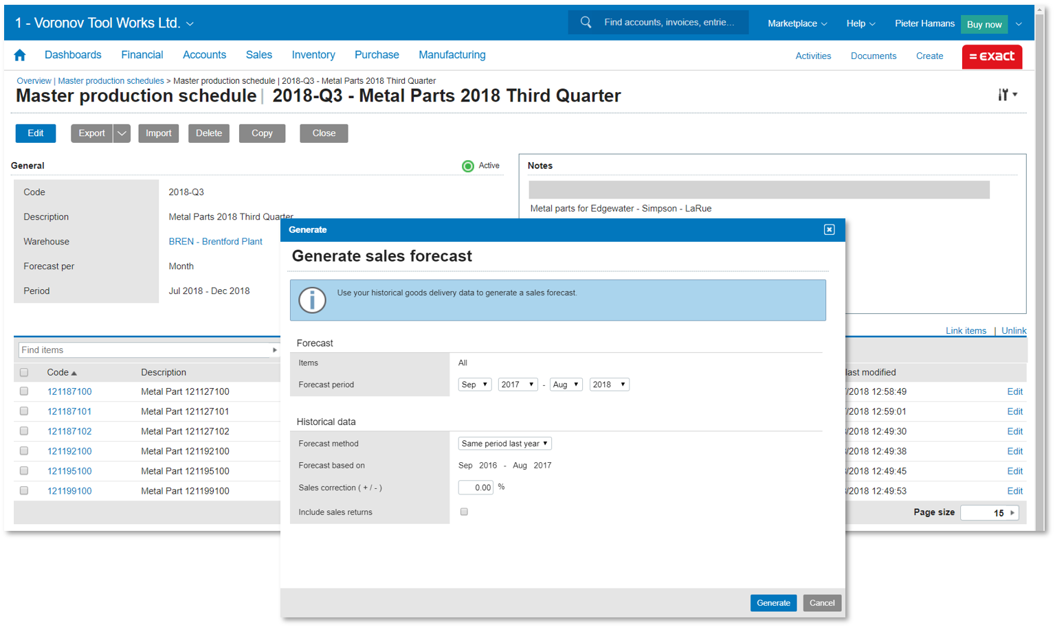 Which manufacturers benefit from Exact for Manufacturing Premium? Repetitive manufacturers create shop orders from sales orders and/or sales forecasts using the bill of materials and the (current) in-stock quantities. If we want to create shop orders from sales orders in the Exact for Manufacturing Standard or Advanced editions, we either have to create a separate shop order for each sales order (“order controlled manufacturing”), or we consolidate the demand of multiple sales orders into a single shop order taking the in-stock quantity into the calculation (“stock controlled manufacturing”). The drawback of the first mentioned method is a possible inefficiency (too many orders for the same part), while the drawback of the second method is that we possibly produce for sales orders that are too far out in the future and therefore will create higher inventories. With Premium we take best of both worlds, and more. Not only can we generate time phased shop orders (example: this week’s, next week’s), but we can also base our shop order generation (and even purchase order generation) on sales forecasts. Lastly, if we want to produce in a configure to order model, we can build components to stock based on a Master Production Schedule, while we build customized end-products to order. Repetitive manufacturers frequently have the need to make efficient use of warehousing space. The ability to keep the same item on different storage locations contributes to that efficiency, as is the ability to store and retrieve items of a particular serial/batch number in order to pick by expiry date. Multiple storage locations per item is also supported in the REST API, which makes it easy for partners offering warehouse scanning applications to connect to the Exact for Manufacturing Premium data. Users of the Smart Shop Floor app connected to an Exact for Manufacturing Premium subscription can issue and receive items from and to storage locations of choice, including serial/batch items. Lastly, as repetitive manufacturers often have more governance structure in their organization, they would like to implement approval steps for quotations and sales orders so that applied pricing, committed quantities and delivery dates are validated by a designated role in the company. Release overview Exact for Manufacturing Premium edition inherits all functionality of Exact for Manufacturing Advanced edition and all functionality of Exact for Wholesale Distribution Premium edition. The functionality of Manufacturing Advanced is extended with: