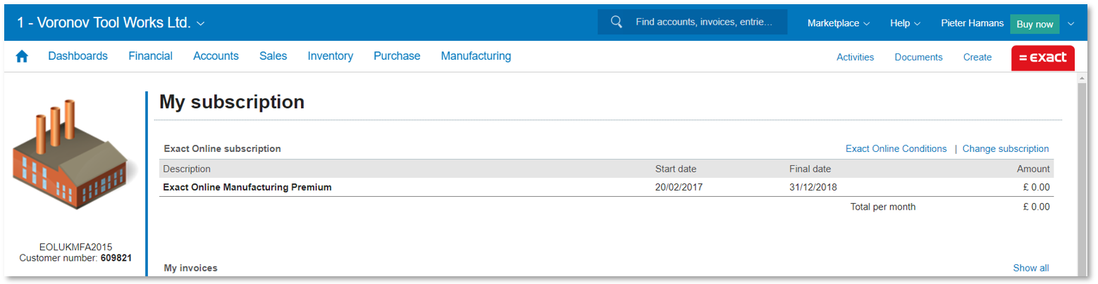(Click to enlarge) How to order From a free trial subscription: proceed with Buy now (right upper corner). From a commercial subscription: proceed to pressing on your name (right upper corner), go to the tab My subscription, Change subscription (hyperlink in right upper corner) and upgrade to Exact for Manufacturing Premium.