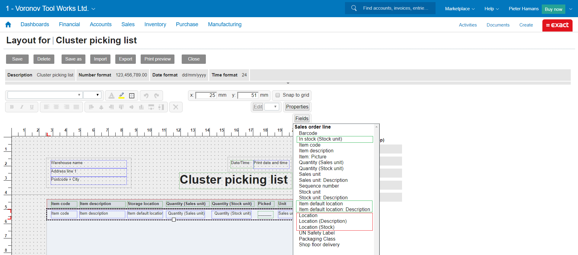 Storage locations in Exact Online In the Plus editions of Wholesale Distribution and Manufacturing we introduced the concept of storage locations. They have been implemented as labels on the item master. The locations are maintained on the warehouse master. One of the locations on the warehouse master is the “(Warehouse) Default location”. When we view inventory reports or print layouts we show as storage location the “(Item) Location” (of which we have only ONE per item/warehouse), and in absence of a location assignment the “(Warehouse) Default location”. There is no actual record in the Plus editions of inventory residing on a storage location! In the Professional editions of Wholesale Distribution and Manufacturing we do keep record of inventory on storage locations (provided that you set your warehouse(s) to “Use storage locations”. If we make a downgrade from Exact for Manufacturing Professional (or Exact for Wholesale Distribution) to Exact for Manufacturing Plus (or Wholesale Distribution Plus), our inventory will be automatically assigned back to the “(Item) Location”, and in absence of a location assignment on the item master to the “(Warehouse) Default location”. This may come to some as a misplacement though no inventory has actually moved: we only lost the ability to truly manage storage locations. Picking lists updates We have four picking list layout types in Exact for Manufacturing, and two in Wholesale Distribution: The Manufacturing picking list, the Manufacturing cluster picking list (both manufacturing only), the Picking list and the Cluster picking list. The fields Location, Location (Description) and Location (Stock) are no longer supported and should be removed. Only Item default location, Item default location: Description and In stock are supported (and may be inserted instead!).