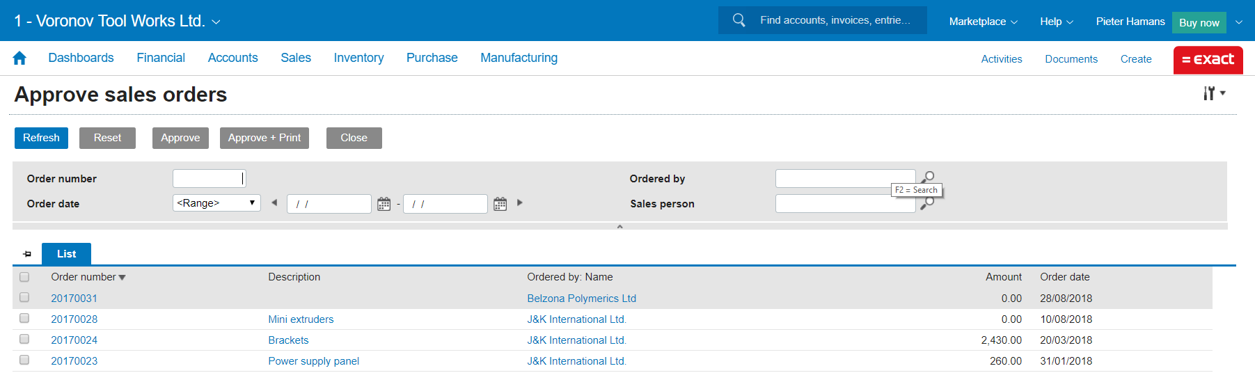 (Click to enlarge) Approving quotations and sales orders Since Exact for Manufacturing Plus and Exact for Wholesale Distribution Plus do not offer functionality to approve quotations and sales orders, ALL quotations and sales orders that have not yet been approved need to be approved prior to downgrading. Use the path [Sales] Orders, Approve and [Sales] Quotations, Approve to check for unapproved sales orders and quotations: