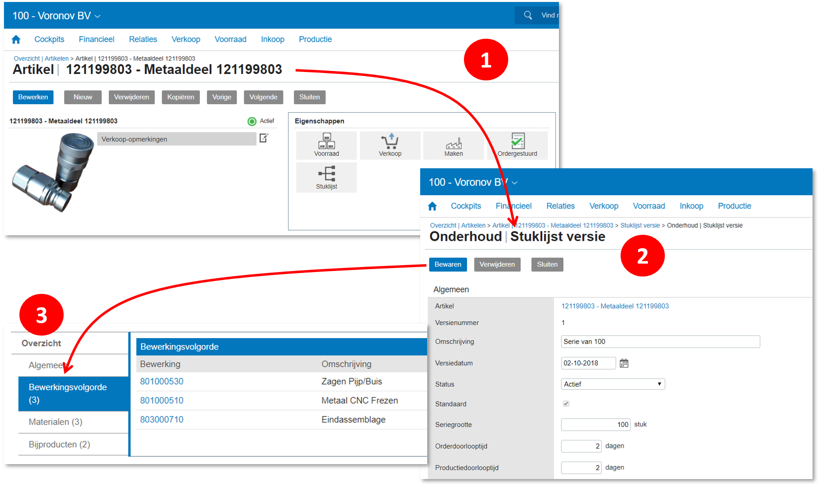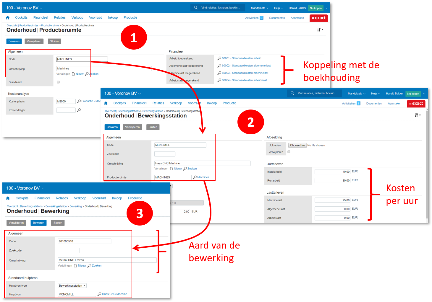 Vaak bestaat een stuklijst niet alleen uit de te gebruiken materialen maar ook uit de benodigde bewerkingen. We moeten de bewerkingen inrichten voordat we een stuklijst met bewerkingsvolgorde kunnen maken. Het stappenplan om bewerkingen in te richten kent drie stappen: ❶ We maken een Productieruimte via het pad [Stamgegevens] Productie, Productieruimtes. Denk bij een productieruimte aan een afdeling zoals spuitgieten of assemblage. We kunnen aan de productieruimte een aantal grootboekrekeningen koppelen. Zonder deze worden er geen productiekosten geboekt! De meeste productiebedrijven vullen alleen de rekeningen voor Arbeid toegerekend en Machinelast toegerekend in. Arbeid toegerekend is de dekking voor kosten van arbeid, en Machinelast toegerekend is de dekking voor de kosten van afschrijving, onderhoud en energiegebruik van machines. ❷ Nu kunnen we een of meer Bewerkingsstations aanmaken via [Stamgegevens] Productie, Bewerkingsstations. Een bewerkingsstation is een machine of productielijn zoals een CNC machine, een spuitgietmachine of een montage cel. We koppelen het Bewerkingsstation aan de/een Productieruimte, en we vullen de kosten per uur in. Bij arbeid kunnen we een onderscheid maken tussen Instelarbeid en Runarbeid, bij Machinelast wordt het uurtarief voor zowel instel- als runactiviteit gebruikt. De tarieven zijn belangrijk voor de voor- en nacalculatie. ❸ Tenslotte kunnen we één of meerdere Bewerkingen inrichten die we koppelen aan de Bewerkingsstations. Bij bewerkingen kunnen we denken aan het boren van een gat, het snijden van een plaat of een activiteit als kwaliteitscontrole. We kunnen eventueel een standaard duur (tijd) inrichten, en een tekst met instructies voor de werkbon voorbereiden.