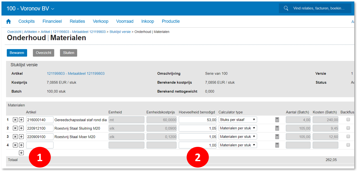 Via het tabje Materialen kunnen we materialen toevoegen. Ook dat is relatief eenvoudig: ❶ We kiezen een Artikel (we kunnen zoeken met F2), en ❷ We vullen een hoeveelheid in. Let op dat het product (Artikel) een voorraadeenheid heeft, zoals Doos, Stuk of Liter, en dat we de materialen definiëren voor het maken van 1 Doos, 1 Stuk of 1 Liter. Daarbij wordt voor de materialen ook als eenheid de voorraadeenheid van het artikel gebruikt. Let op dat we een drop down lijstje hebben genaamd Calculator type. Normaal hebben we daar de keuze Materialen per stuk nodig. Maar we kunnen bijvoorbeeld ook 8 Stuks per materiaal rekenen, als we willen dat we 1 doos voor 8 stuks product nodig hebben. (Anders zouden we als hoeveelheid 0,125 moeten invullen, wat niet alleen niet kan met de decimalen, maar wat ook onduidelijk is. Wat bedoelen we eigenlijk?)
