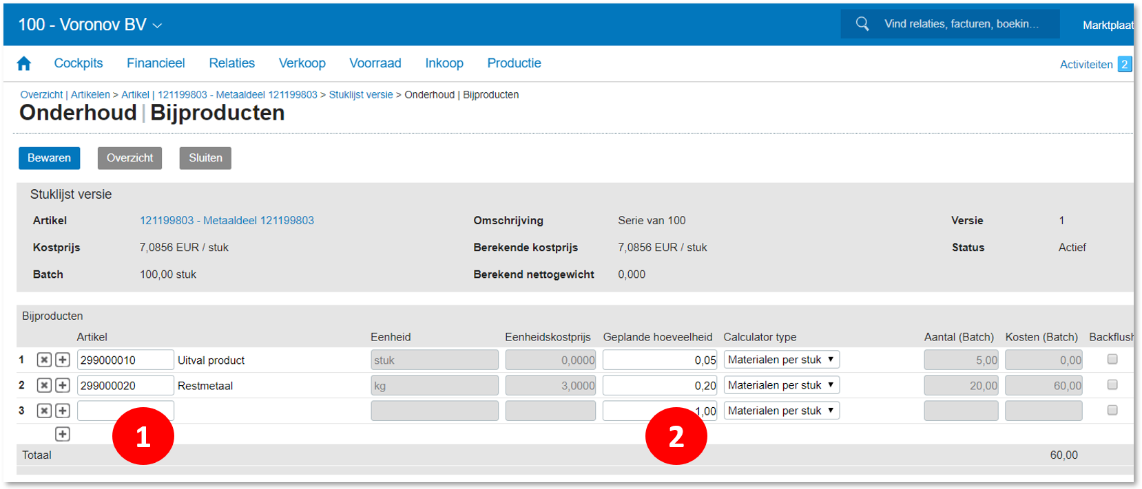Bijproducten zijn bijvoorbeeld afvalartikelen zoals metaalresten of uitvalartikelen zoals afkeur van een product. Alleen in Exact voor Productie Geavanceerd of Premium kunnen we met bijproducten werken. Bijproducten kunnen een kostprijs hebben (waarde van restmetaal) of we kunnen er voor kiezen dat we ze niet waarderen in de voorraad (kostprijs nul). Via het tabje Bijproducten kunnen we bijproducten toevoegen: ❶ We kiezen een Artikel (we kunnen zoeken met F2), en ❷ We vullen een hoeveelheid in.
