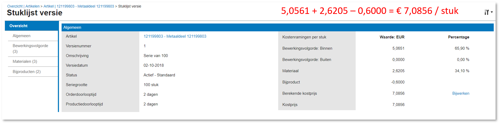 Als we alle bewerkingen, materialen en bijproducten hebben ingericht kunnen we op het tabje Algemeen een opbouw van de kostprijs vinden. De Bewerkingsvolgorde: Binnen zijn de kosten bewerkingen die we hebben ingericht die plaats vinden op onze eigen bewerkingsstations. De Bewerkingsvolgorde: Buiten zijn de kosten van het uitbesteed werk. Ook de kosten van het Materiaal worden bij de bewerkingskosten opgeteld, maar de kosten van Bijproducten worden afgetrokken van de kostprijs aangezien ze een opbrengst zijn. Als de Kostprijs van het (product) artikel afwijkt van de Berekende kostprijs van de stuklijstversie kunnen we via de link Bijwerken de kostprijs van het artikel gelijk maken aan de ingerichte stuklijst. (Als we een groot aantal stuklijsten willen bijwerken hebben we daar andere processen voor, zoals [Productie] Analyse en resultaten, Kostprijsberekeningen).
