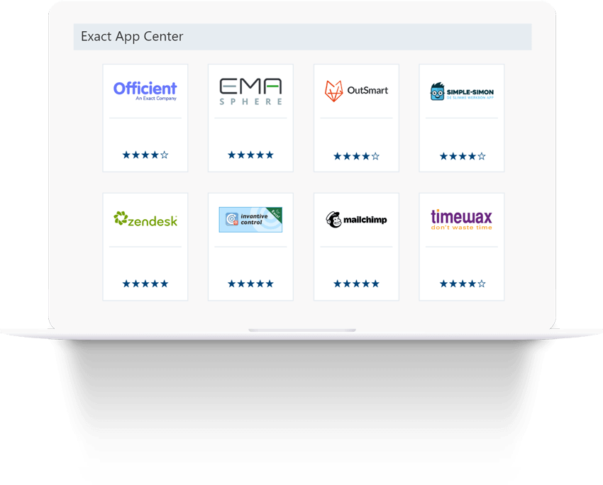 Développez votre logiciel avec une solution industrielle ou connectez-le avec l'un des 370+ logiciels d'entreprise. De nombreux programmes peuvent être reliés en moins de 5 minutes ! Tirez le meilleur parti de votre logiciel Exact grâce à des outils spécifiques d'enregistrement du temps et de facturation comme les liens bancaires, la gestion des services, les ressources humaines et les outils intelligents pour automatiser les bons de travail et les factures entrantes. Aucun autre éditeur de logiciels n'offre un tel niveau de connectivité !