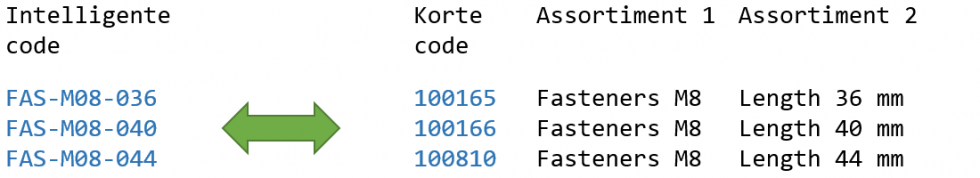 Een andere overweging is of we een intelligente artikelcode moeten introduceren. In een intelligente artikelcode kunnen we herkennen tot welk assortiment het artikel behoort (lampjes of weerstanden), het materiaaltype (SJ355) of de afmeting (20 mm).
