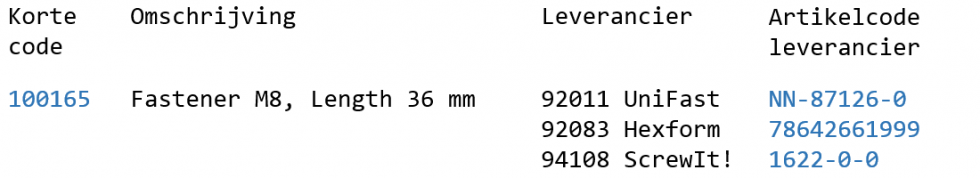 Twee belangrijke overwegingen spelen een rol. De eerste is, of we onze eigen artikelnummers (-codes) gaan introduceren, of dat we leveranciersnummers gaan gebruiken. Waar het natuurlijk gemakkelijk is om leveranciersnummers te hergebruiken (“copy en paste”), lopen we dan het risico dat we hetzelfde materiaal willen inkopen bij een andere leverancier (nieuwe code introduceren dan maar?), of dat verschillende leveranciers hetzelfde nummer gebruiken voor een verschillend materiaal. Met de adoptie van nummersystemen van verschillende leveranciers krijgen we nooit orde en netheid in ons eigen systeem! De meeste productieoplossingen maken het mogelijk om de leveranciersnummers separaat van het eigen artikelnummer op te slaan.