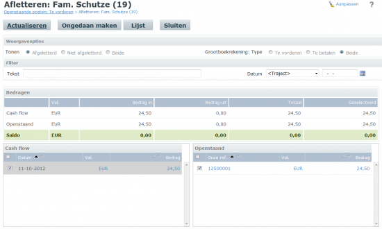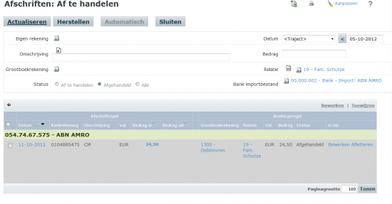 Hierdoor wordt de transactie opgeslagen zonder de aflettering en krijgt de boeking weer de status 'Af te handelen'.