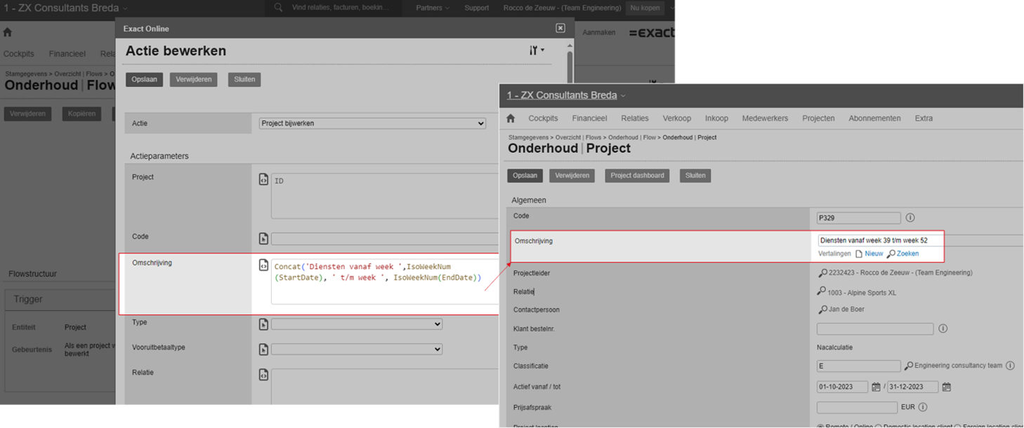 Met de nieuwe toegevoegde functies heb je ook meer mogelijkheden om gegevens op een andere manier weer te geven. Stel, je wilt automatisch budgetregels binnen een project laten aanmaken waarbij de omschrijving een periode weergeeft, zoals bijvoorbeeld: “Werkzaamheden – vanaf januari 2024 (week 1 – 5)”. Als je dit wilt doen dan kun je handig gebruik maken van bijvoorbeeld functies die teksten samenvoegen (Concat) en weeknummers weergeven op basis van data (IsoWeekNum) (zie afbeelding 4).