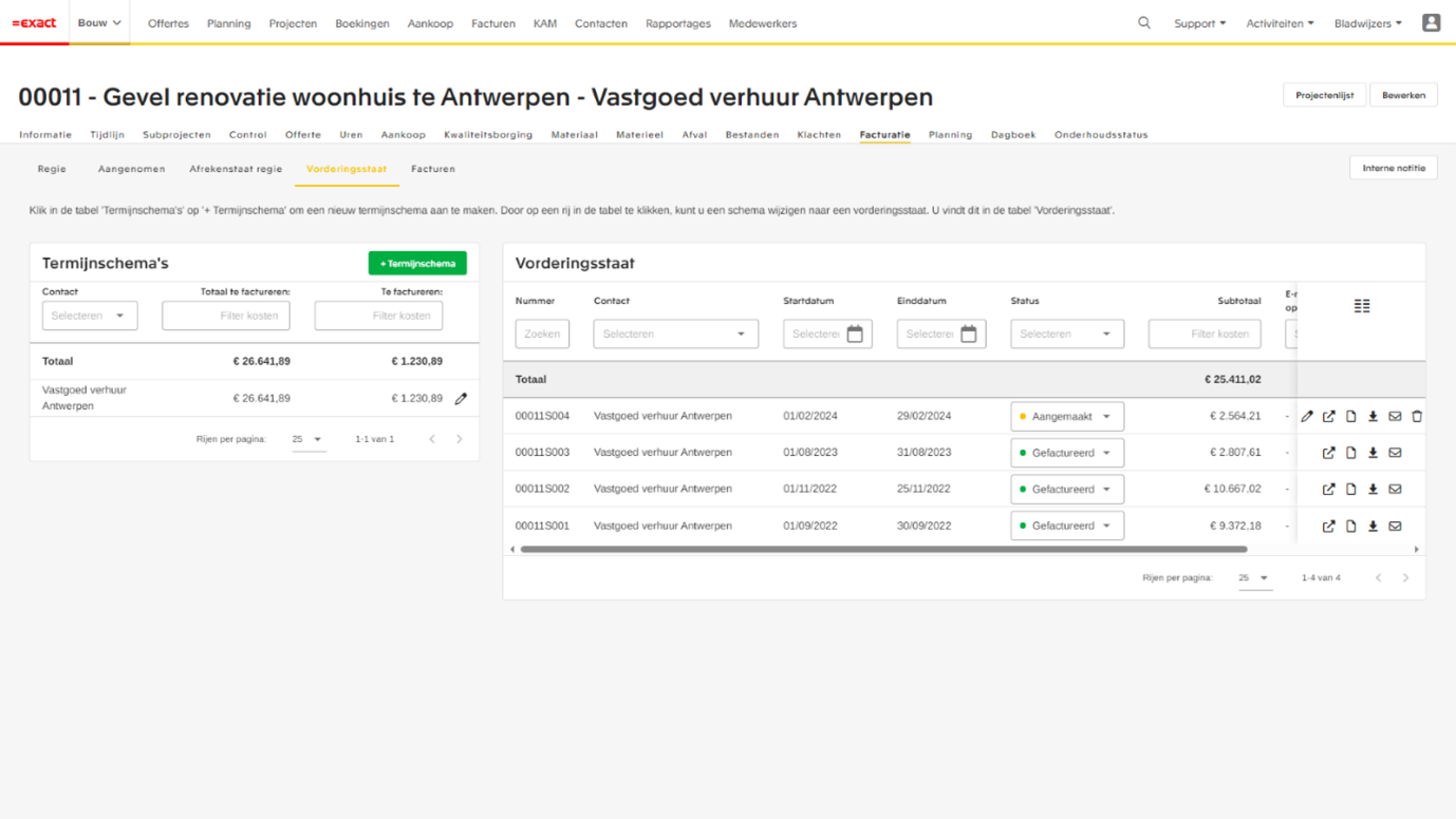 In Exact Online Bouw zie je in één overzicht direct welke termijnen er al gefactureerd zijn en welke aantallen nog opgevraagd mogen worden. Je kunt gemakkelijk een vorderingsstaat versturen en na akkoord van de opdrachtgever worden alle gegevens automatisch meegenomen in de factuur.