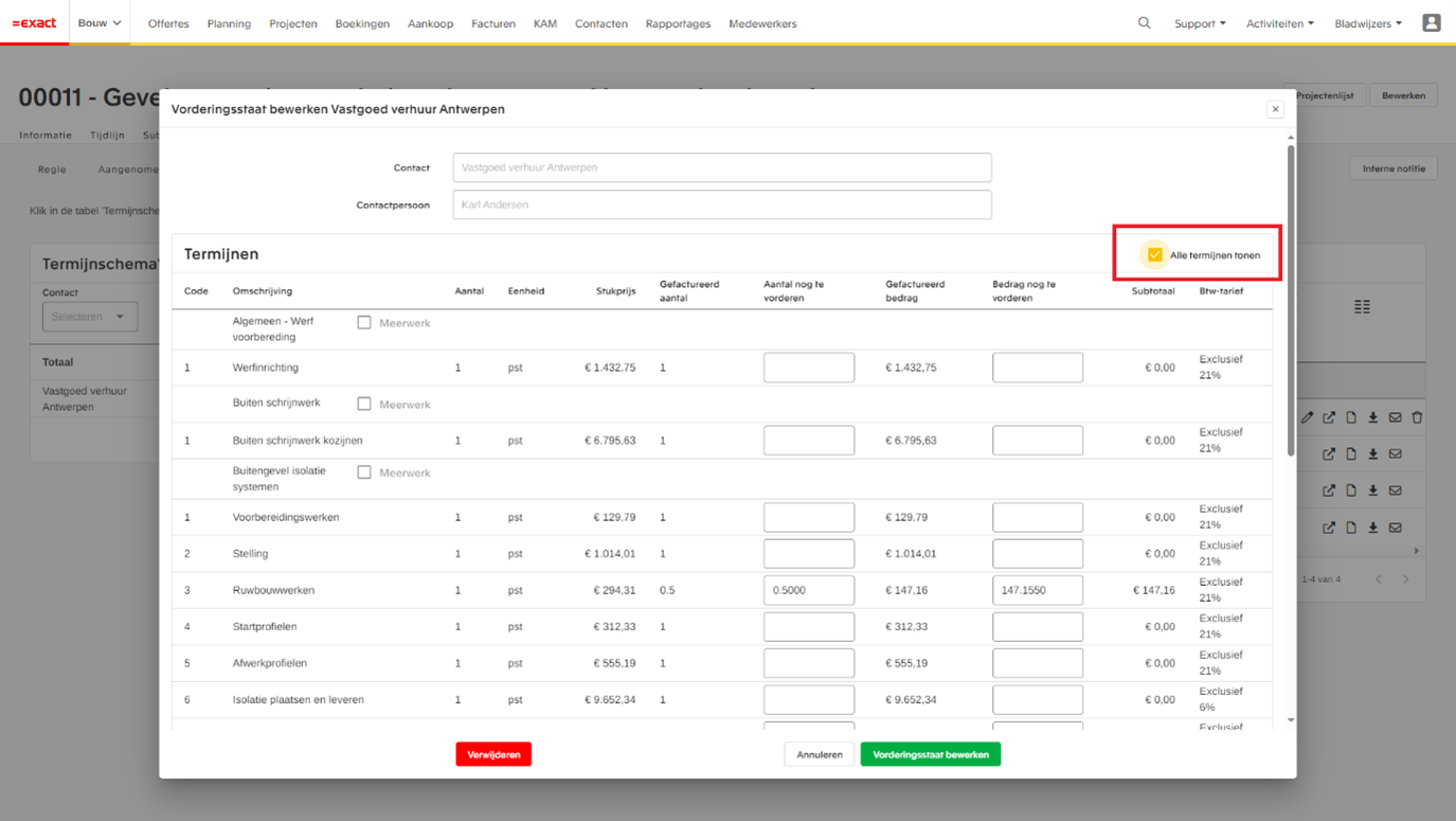 We hebben het werken met de vorderingsstaat aanzienlijk vereenvoudigd, vooral in situaties waarin een opdrachtgever een aanpassing wenst. Voorheen kon je alleen bestaande regels wijzigen, wat het lastig maakte om extra termijnen toe te voegen.