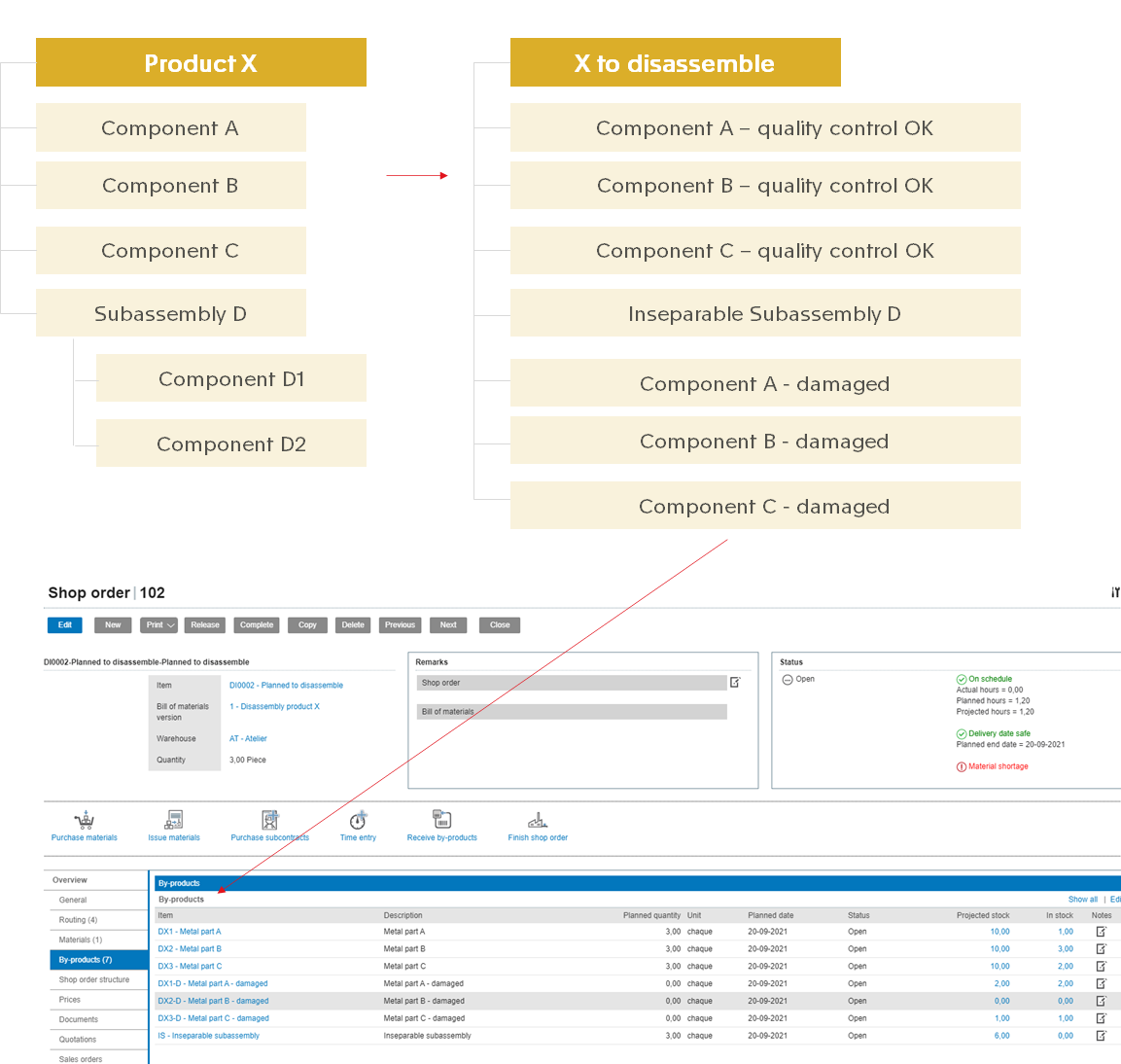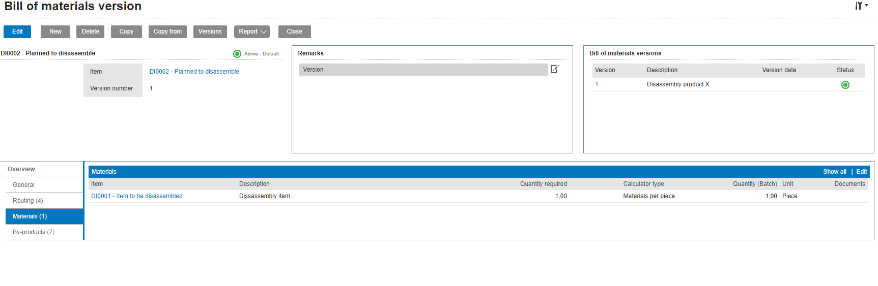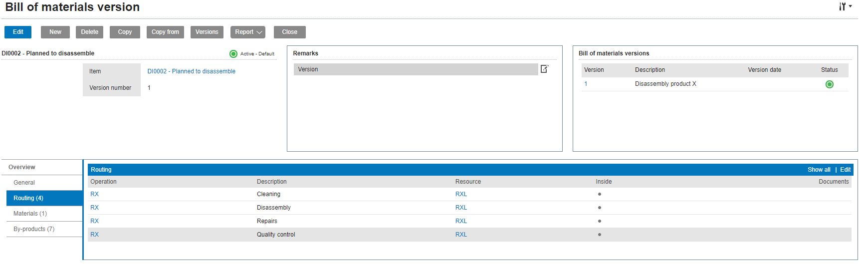 We’ll use a ‘virtual’ item to manage the disassembly process. It is a virtual item since we do not physically stock this item, we merely use it to manage the disassembly process. This item has a linked Bill of Materials (BOM) that contains the routing of disassembly operations, materials needed, and the planned output of the disassembly work. The planned output is registered using by-products.
