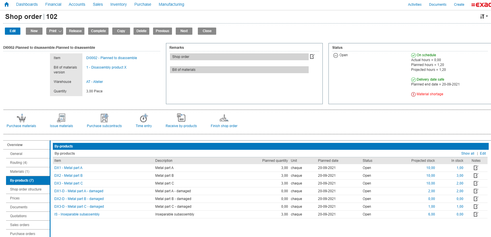 Exact Online for Manufacturing helps you to efficiently manage the disassembly process, and at the same time it helps you to gain insight into the cost of disassembly operations such cleaning, inspection, and quality control.