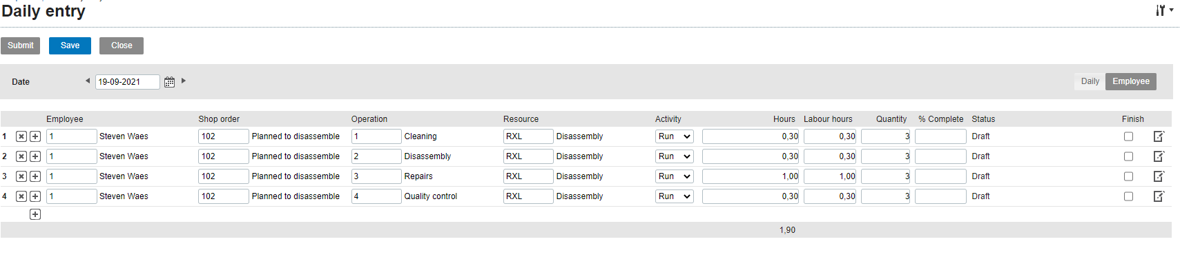 Next, we’re start with the disassembly work. You can track time spent in Exact Online. In this case we spent nearly 2 hours on disassembly work, mainly caused by some additional repair work. Tracking time spent gives insight into the cost of disassembly.