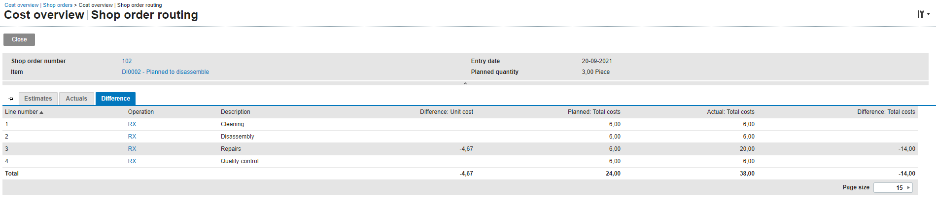 After disassembly, we can complete the work order. We can gain valuable insights into the cost of disassembly. For example, we can monitor planned vs. actual disassembly costs, as shown in the figure below.