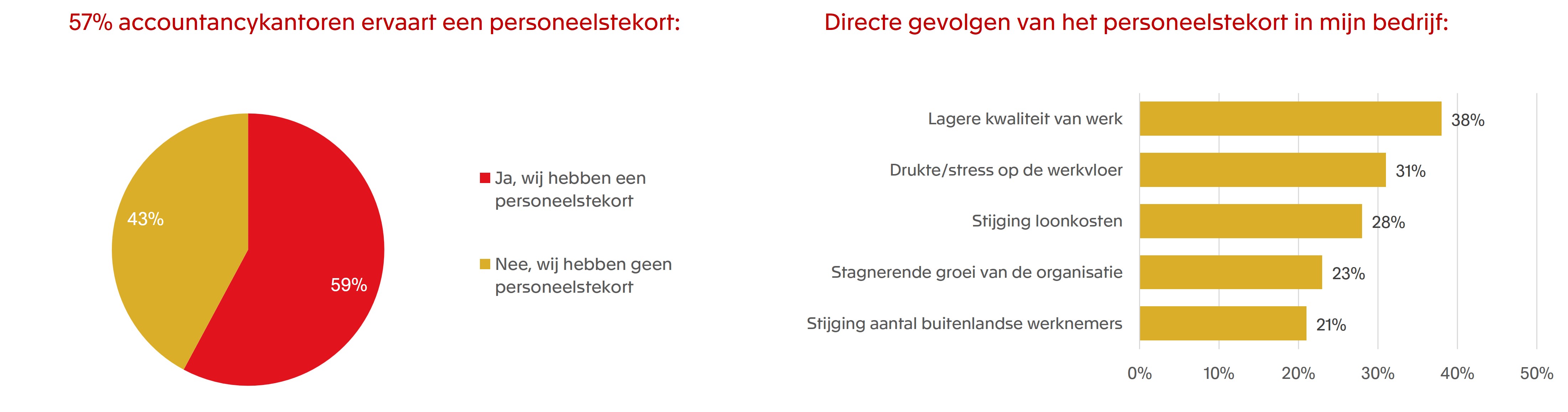 59% van de accountantskantoren in Nederland heeft momenteel een tekort aan personeel. Dat blijkt uit het grootschalige, onafhankelijke Exact MKB Barometer onderzoek dat recentelijk is uitgevoerd onder accountants en mkb’ers in ons land. Behalve dat dit zorgt voor stress en drukte op de werkvloer en stijgende loonkosten, geeft vier op de tien respondenten aan dat de kwaliteit van werk lager is. Bijna een kwart laat weten dat personeelstekort de groei van de organisatie stagneert.