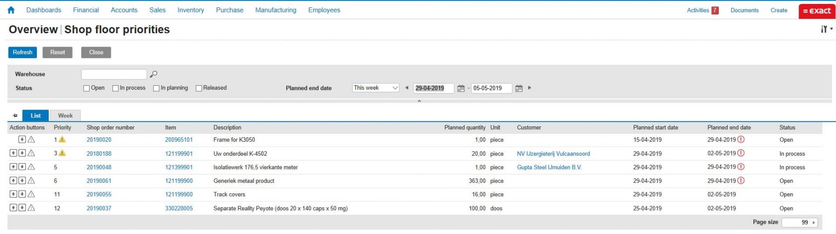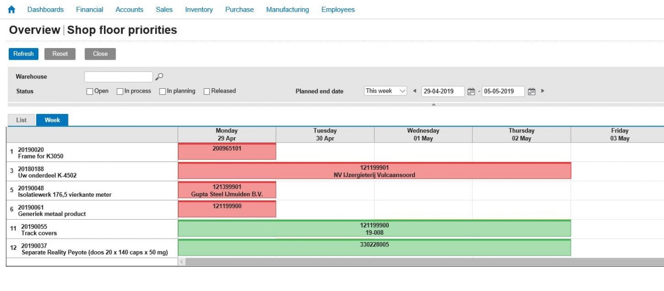Determine the correct priorityAfter activation you have extra menu options available. These can be found in the menu "Manufacturing / Planning / Shop floor priorities". Here you will find 2 tabs: "List" and "Week".