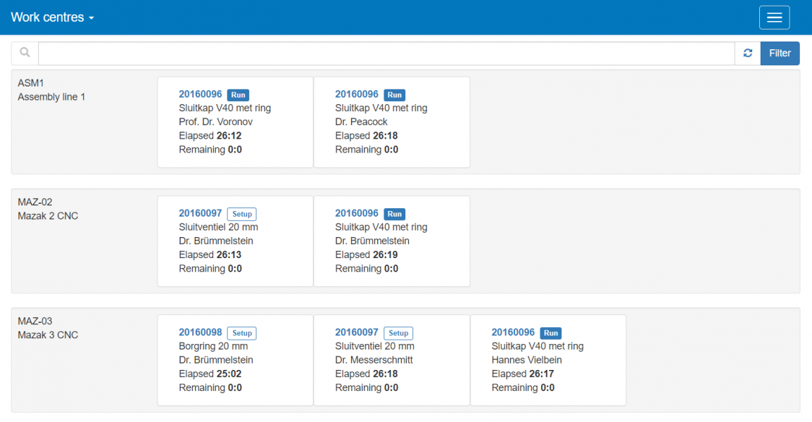 With the view mode by work centres we see at which work centres work is performed and by whom and on which order. We also see the progress (Time elapsed and Time remaining). With the filter on the right side of the screen we can select a production area or a number of work centres:
