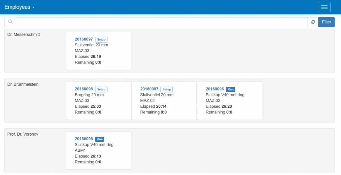 With the view mode by employees we see which employees are working at this moment, on which work centre, and on which order. We also see the progress (Time elapsed and Time remaining). With the filter on the right side of the screen we can select a number of employees: